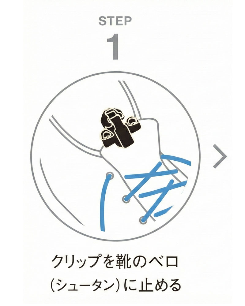 ひも先を靴ひもの下側に通し、ストッパーとクリップの位置を調整する。