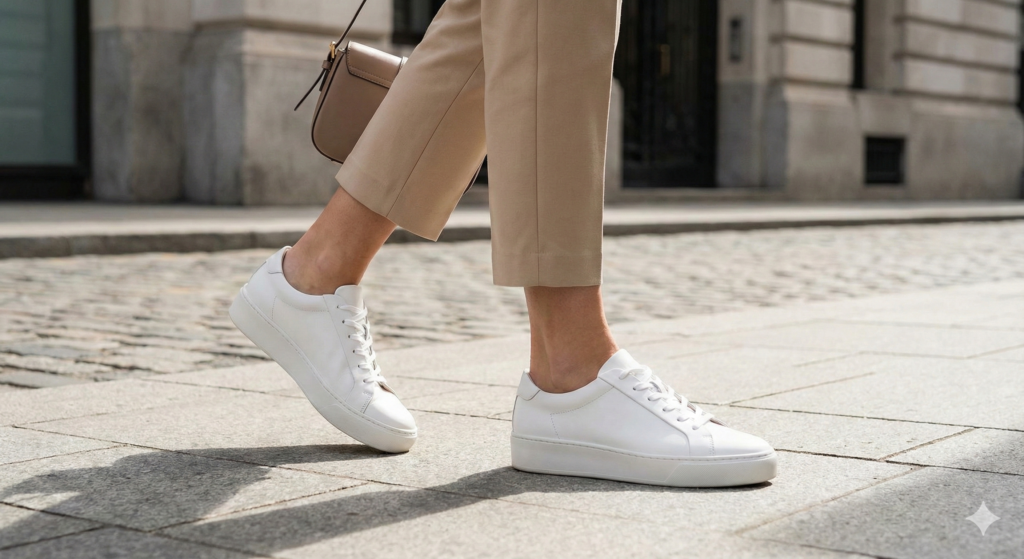 仕事中の足元を上品に演出。パンプス疲れの日の「きれいめスニーカー」スタイルにも最適