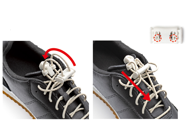 クリップに通してからストッパーの下部穴に靴ひもを通す。
