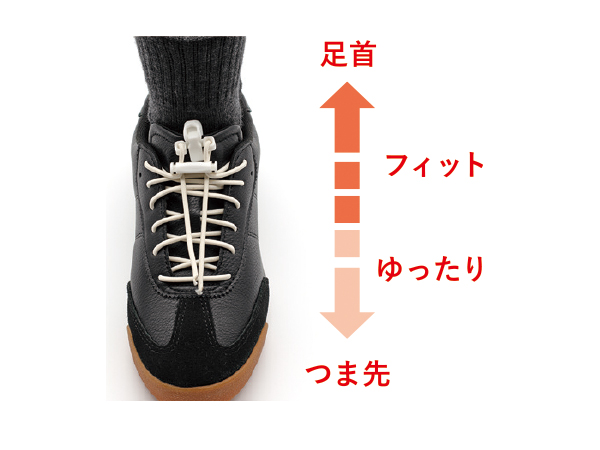 あまり知られていませんが、足と靴をフィットさせ安定して快適に歩くためには、靴ひもを適切に調整することが、非常に大切です。そのため、「しっかり靴ひもを締め直してくださいね」と声をかけるのですが、私たちがどれだけ言っても、実際には「面倒だから」「脱ぎ履きしにくいから」と、ちっともやってくれないのです。